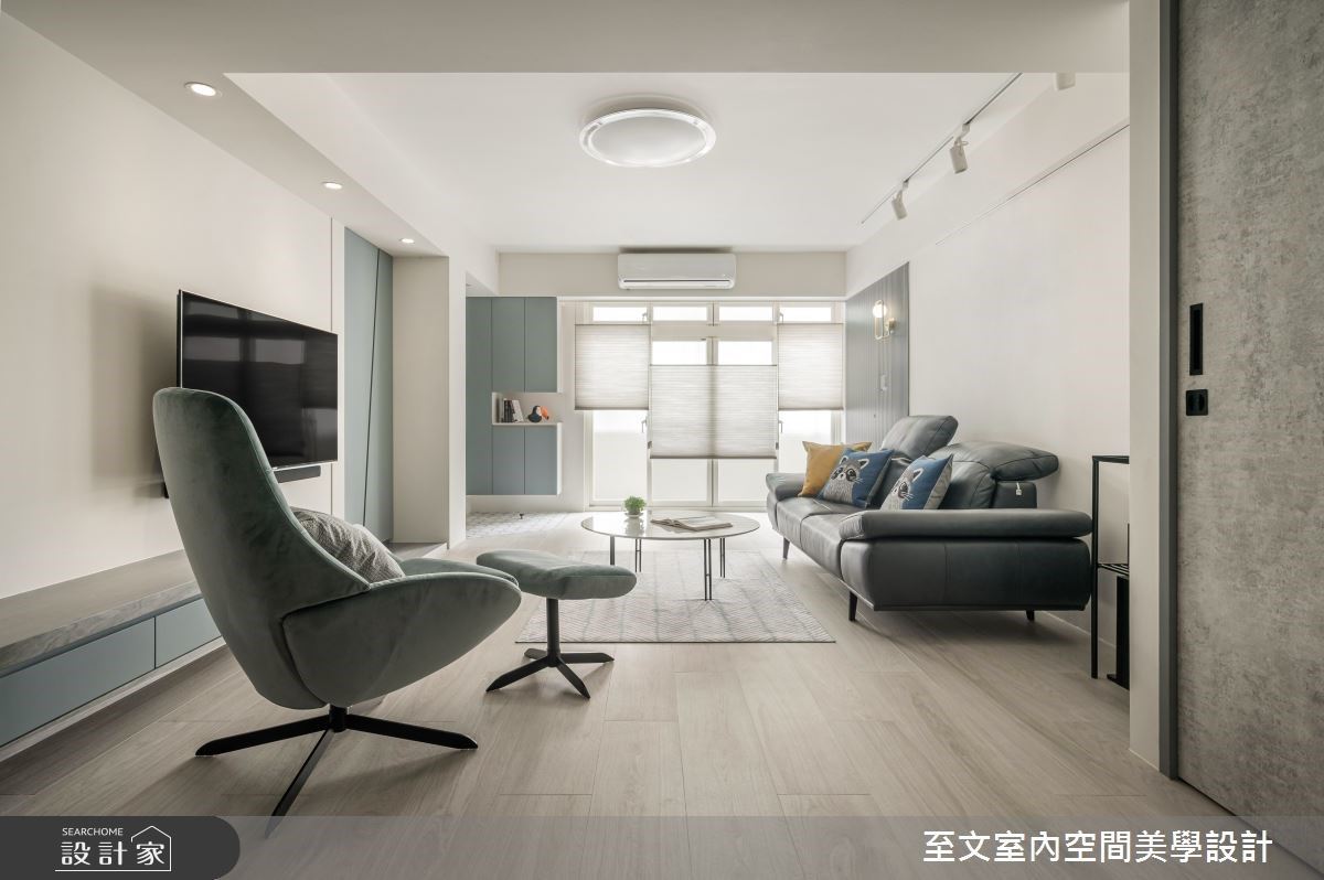 此案為35坪的老屋翻新,透過白色為基底,拉闊空間視野;灰色系搭配清爽湖水藍,展現優雅氣質;佐入溫潤木質的地坪與局部天花與壁面,