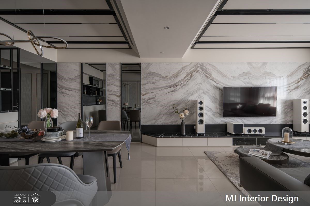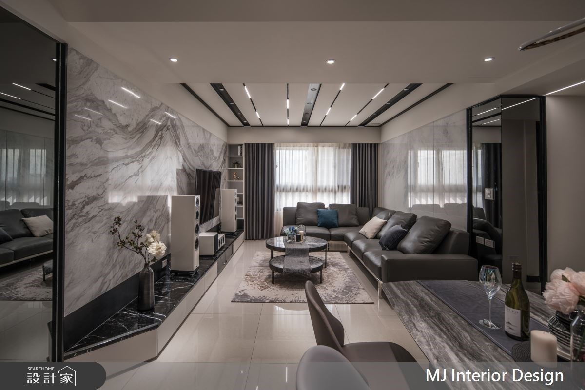 現代風為設計主軸的 30 坪空間,以大面積白色襯底,透過多元化選材,如石材、皮革、鍍鈦、鏡面等,相互堆疊加諸空間的色彩及層次,整