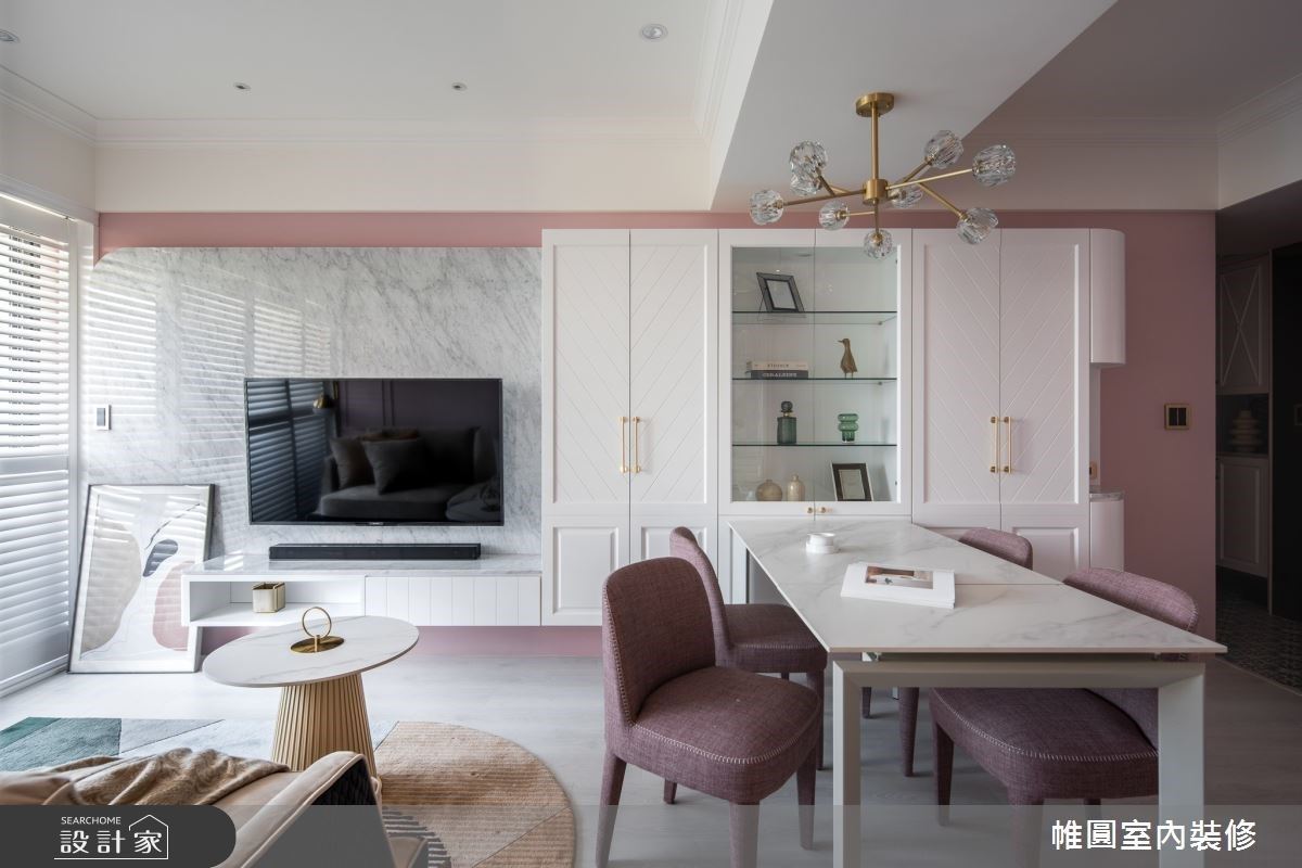 由粉嫩色調為空間主色彩計畫的 25 坪空間,洋溢著青春活力的氣息,透過各式拼搭元素及色彩應用, 讓有限的空間內替一家四口創造魔幻的