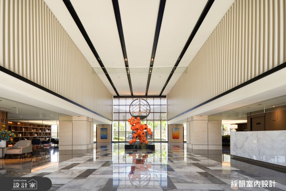 坐落於桃園一處高端時尚的建案設計,被自然綠意環繞,建築體以玻璃帷幕引入戶外採光及綠意景致。推開大門走進室內,灰底、黑色波浪狀