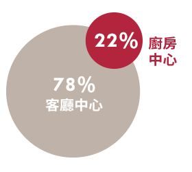 廚房在家中的地位越來越高,甚至和客廳平分秋色!另外,調查中更意外發現,22 % 屋主的廚房面積,竟比客廳坪數還要大!