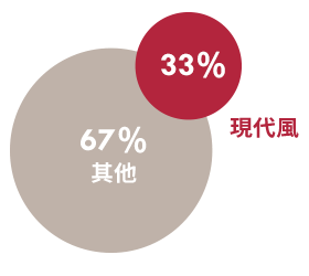 由調查發現,每3 個家庭就有1 個選擇「現代風」,相較其他風格,現代風更注重機能的規劃,並具有俐落簡潔的線條、色調。