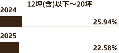 12坪(含)以下~20坪總價門檻較大坪數低,吸引首購族、小資族、單身者,但公設佔比高,且房市若因利率變動,投資型的小宅易受衝擊,因而比率下滑,裝修多採輕裝修或軟裝布置為主,注重空間穿透性、雙面牆等複合式設計。
