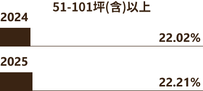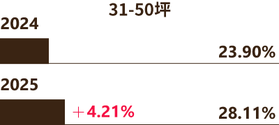 21-30坪適合小家庭、雙薪族群。雖然2025年微降至27.10%,仍是市場主力區間之一,需求仍穩定,此坪數格局多為3房2廳,裝修上加入低奢質感,強調開放式公領域、玻璃隔間、拉門或多功能區延展視野。