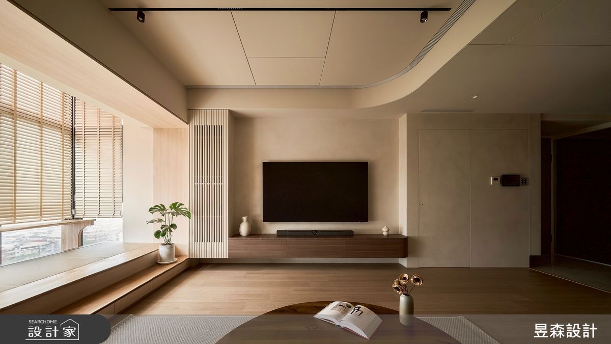 65 坪的新東方大宅,面向綠意盎然的山景,擁有充沛的採光,而原先房間數較多,後來在設計師調整為三房兩廳的格局之後,打造出三代同堂開闊的自然感居家。玄關運用一整面沉穩的石材牆,加上天花的木條裝飾,導引視線至寬廣的公領域及陽台景觀,令人一進門即感受到優美的自然風光。客廳以圓弧手法裝飾木質牆面,減少內凹區