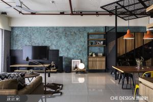 為滿足喜愛工業風的年輕夫妻,設計師植入年輕現代化的新穎元素,除了鐵件、木紋的安排,電視牆更揮灑大膽的青銅仿飾漆,跳脫工業風的既定印象,創造開放寬敞的動線,形塑舒適、風格別具的優質家屋。為了避免一進門就看到客廳的風水疑慮,藉由網狀的鐵件屏風設計界定出玄關與公領域,透視效果讓空間更有互動性,再搭配一張穿