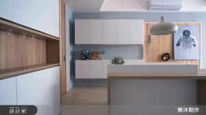 為保留小坪數的空間感,進門玄關處不做屏風設計讓進門視線格外開闊,板岩作為整面鞋櫃的面材,粗糙質樸的自然紋理形塑出質感端景,電視主牆銜接卡拉拉白石材的質地與色澤在灰黑為主調的空間被凸顯出來。開放式餐廚區用懸吊餐燈作為視線引導,帶出開放式廚房中島與用餐空間的整體設計。