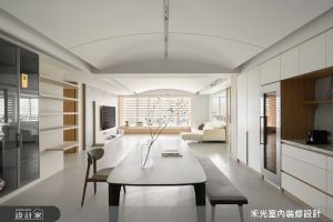 66坪現代簡約宅,有著一望無際的城市窗景,京璽國際股份有限公司 周彥如設計總監 善用空間最大優勢,將室內空間比擬為船身,整合場域規劃於同一軸線,並於居宅中融入藝術、生活、綠意等設計理念,給予旅美多年回台的屋主一所舒適愜意的退休宅邸。