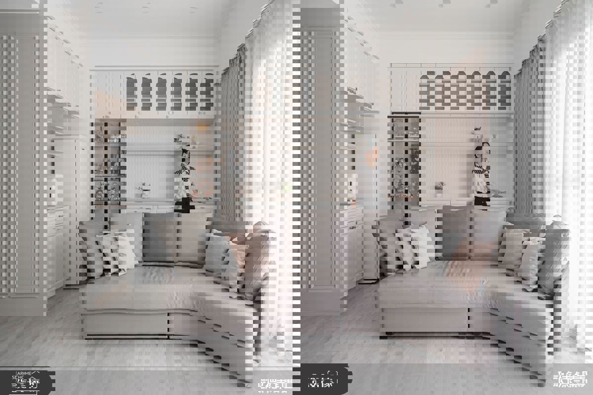 「對外行人而言,收藏品只不過是靜止的裝飾;但在藏家眼中,分毫都是家中充滿生命力的一份子。」將屋主的公仔及潮流單品收藏視為家裡的一份子,進門後開放式餐廚區的牆面劃圓形排列的櫥窗,圓形開孔像是電影的聚光燈,讓每一個年代的收藏公仔擁有自己的角色故事,將屋主成長的記憶刻畫在 21 坪毛胚屋裡。