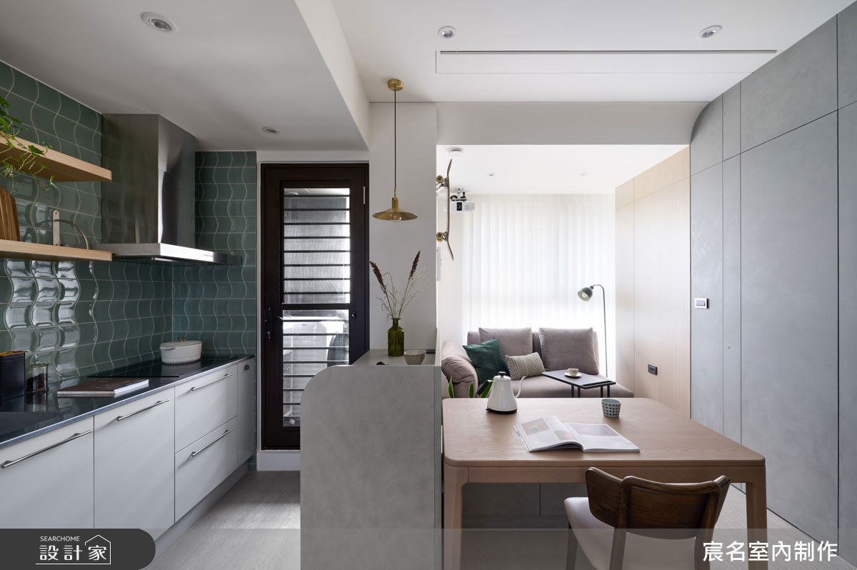 18坪的小宅中,承載是居住者對家的無限想像與期待。屋主希望進門玄關處具備落塵區,好讓外界的塵囂停留在門外;想要一間既是閱讀與工作的場所,也能在未來成為孩子的房間的書房。同時,對於熱愛下廚的他們來說,廚房不只是料理的地方,更是家人聚集談心的場域;因此,一個擁有大中島、充足收納、獨特配色的空間,是他們對家的想像。