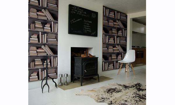 大家一起來找碴:照片中的情景有發現好像哪裡不太對勁嗎?正解:牆上的書架會不會太純白無瑕啦!連架上的書本也一起漂白了嗎?!這不是哪位大師的惡作劇,而是設計師Young & Battaglia為知名壁紙品牌Mineheart設計的一系列創意書櫃壁紙,點綴