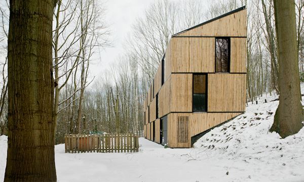 比利時建築事務所AST 77設計的“rotselaar住宅”位於比利時rotselaar一處密林之中。這個長26.3米寬4.5米的住宅坐落在一個傾斜的陡坡上,。建築外立面選用了竹子材料,由黑色金屬條做結構框架。建築師想通過這個竹子立面的設計讓建築與周