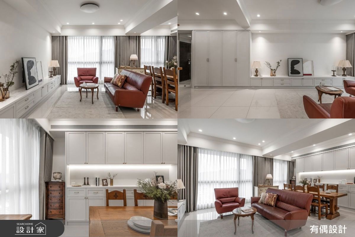 35坪、3房2廳格局的居家空間裡,是屋主送給心愛爸媽的孝親宅。整體空間導入綠裝修的設計手法,打造健康、舒適的樂活生活! 整體以淺色調為基底,並結合女屋主喜愛的法式風格,以及男屋主鍾情的現代簡約風,交織簡約、低調卻充滿質感的室內氛圍。