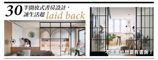 不念書也想要有書房!25+半開放式書房設計,讓生活超laid-back2022-08-04超熱門的2+1房住宅格局,當中的一房多半會規劃成多功能書房,不僅是因為能在有限的坪數中保有空間感與隔間數,面對疫情之下,不論是小孩居家隔離、或是遠距上班,有一個彈性的使用空間已經成為現代住宅標配。有別於過往對書房的印象,以下介紹的書房運用玻璃或活動隔間,打造相對客廳安靜、有隱私性但有能帶著輕鬆氛圍的空間,快來看看有沒有你心儀的放鬆空間吧!