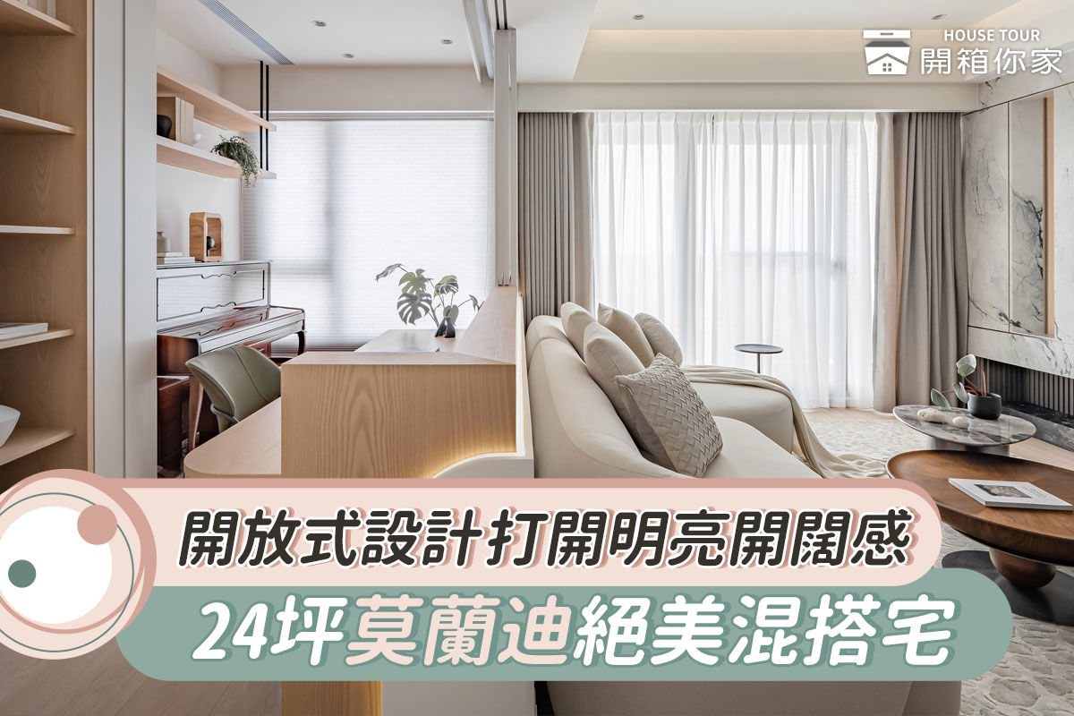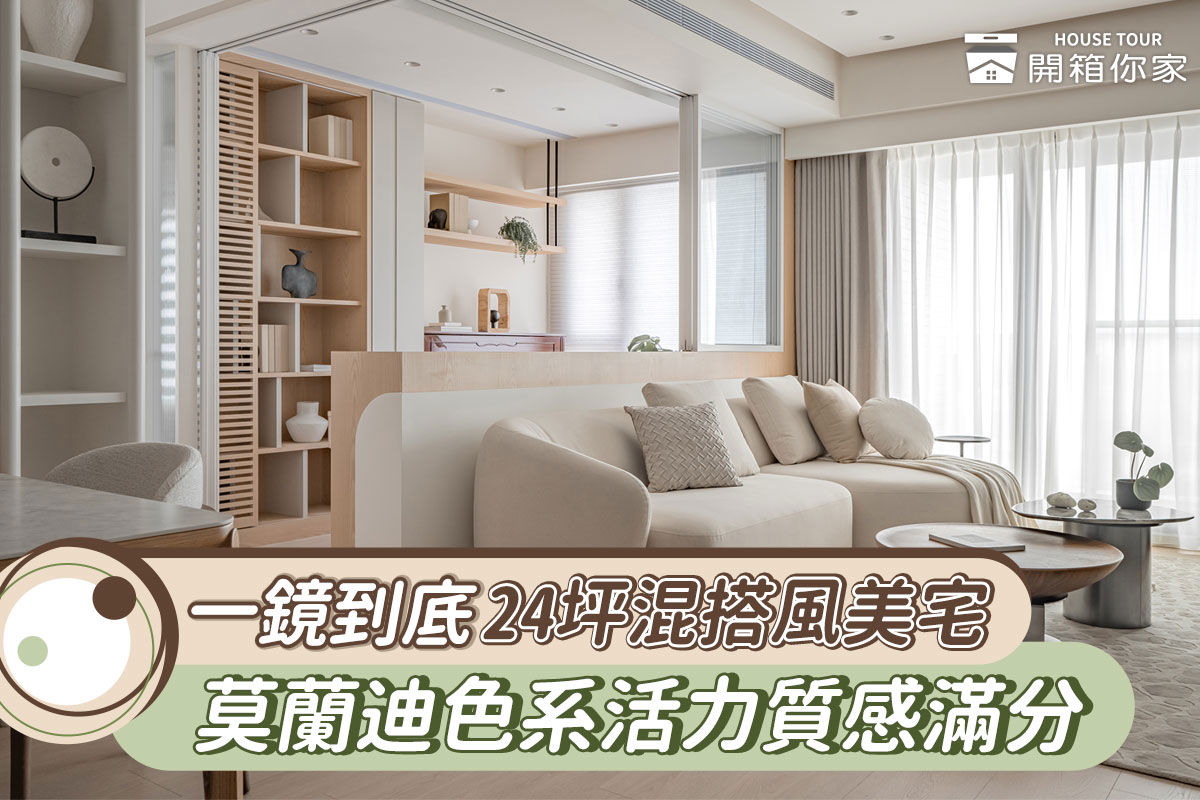 24坪混搭風美宅,莫蘭迪色系搭配質感收納,半開放式廚房與書房...